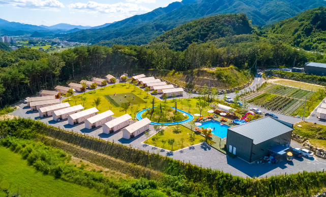 이곳은 주차공간이 넓고 자리가 많아서 불편함이 적고 아이들을 위해 넓은 잔디에 미니 축구장, 놀잇감들도 많이 있어서 가족단위 분들에게 인기 있는 곳이라고 해요. 여름에 운영되는 대형 수영장도 있고, 인근에 시원하게 놀 수 있는 계곡도 흐르고 있어서 방문시 시간을 알뜰하고 실용적으로 활용할 수 있다네요. 글램핑 내부에는 조리도구나 식기류도 깨끗이 관리되어 있고 개별 화장실 겸 샤워실도 있어서 편리하고, 싱크대도 있어서 멀리까지 이동하지 않고 이용할 수 있다고 하더라고요. 친구나 커플 방문시 이용할 수 있는 배드민장, 물총, 트램폴린, 복싱샌드백 등도 있어서 자연 속 리조트처럼 즐길 수 있다고 하니 포천 쪽 대형수영장과 계곡이 있고 활동할 것들이 많은 캠핑장을 찾으시는 분들께 추천드려요!