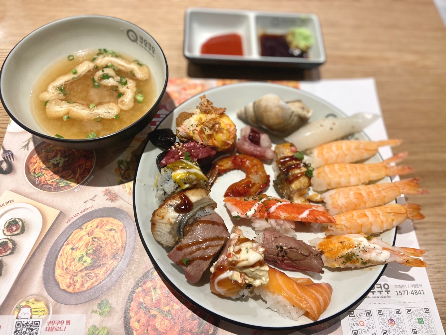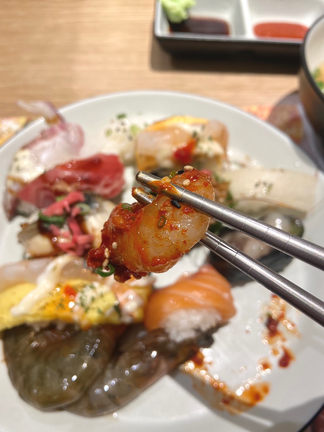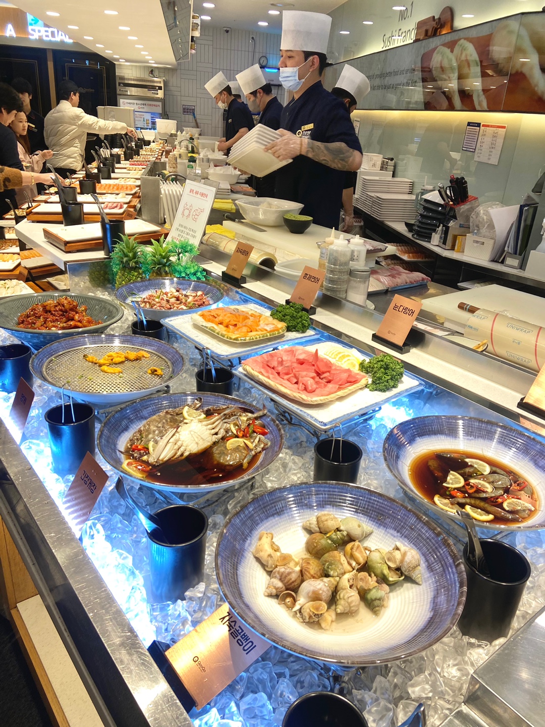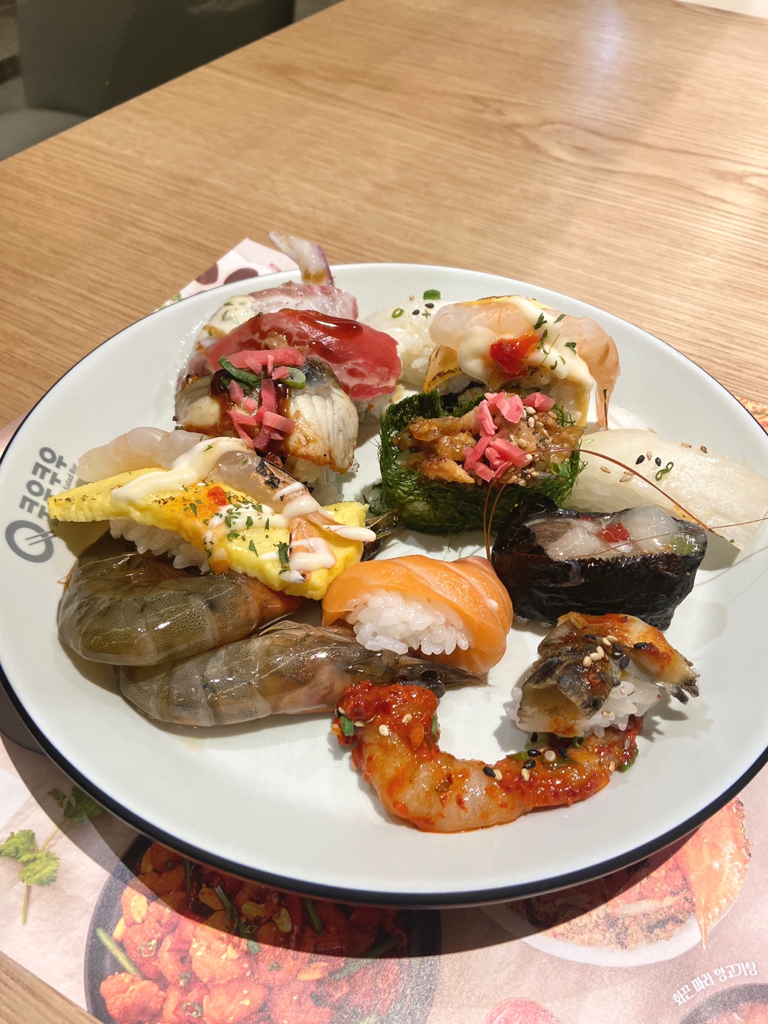 보통 초밥 코너 이외 다른 횟감이나 새우장 등 잘 안 먹는 펜인데, 쿠우쿠우 파주 운정점은 정말 메인을 참 잘하는 곳이었어요. 다 올리기에는 사진이 너무 많아서 몇 가지만 올렸지만, 초밥 고를 때 예쁜 디스플레이 때문에 평소 먹지 않던 종류도 먹어 보고 싶은 마음이 생겼답니다. 신선도도 좋고, 종류도 많고~