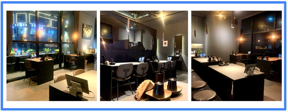 일단 입구부터 하필 좋아하는 진한 네이비 컬러의 템파보드로 깔끔하게 되어 있어서 첫 인상이 좋았는데, 웬걸요?? 푸르스름하게 저녁 시간이 다가온 것도 한 몫했지만 그레이 블랙톤의 아주 세련된 인테리어와 과하지 않은 조명이 와~ 하는 소리가 나올 정도였어요.