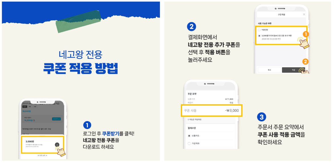 모바일로는 홈페이지 접속 하신 후 로그인->> 결제할 때 네고왕 전용 추가 쿠폰 선택!! 엄청 편하죠 ^^