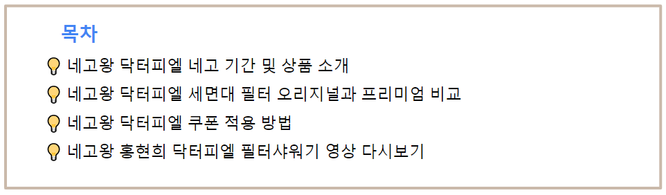 이번 네고는 열여섯번째로 닥터피엘의 인기상품인 샤워 필터 세트 뿐만 아니라 물때 끼일 일이 없는 에코호스, 세면대 필터세트, 주방용 세트, 닥터피엘 피처형 정수기까지 가정에서 두루 사용할 수 있는 실용적인 상품들로 구성되어 있습니다.