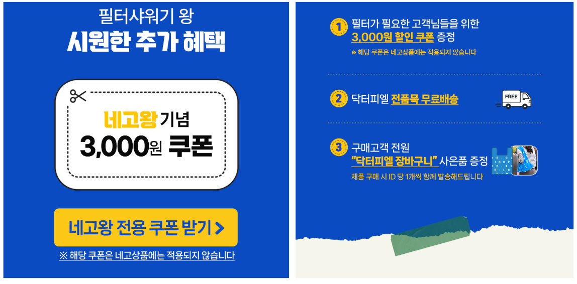 네고 상품 외 닥터피엘 전 상품 3,000원 장바구니 할인쿠폰도 증정되고 있으니 네고가로 구매하지 못한 여행용 필터는 쿠폰 사용해서 조금이라도 저렴하게 구매할 수 있어서 아~주 좋아요! 무료배송은 필수!!!