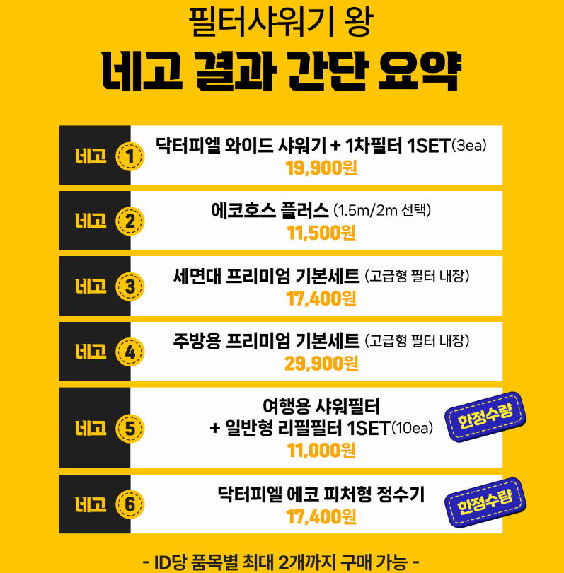이번 네고는 열여섯번째로 닥터피엘의 인기상품인 샤워 필터 세트 뿐만 아니라 물때 끼일 일이 없는 에코호스, 세면대 필터세트, 주방용 세트, 닥터피엘 피처형 정수기까지 가정에서 두루 사용할 수 있는 실용적인 상품들로 구성되어 있습니다.