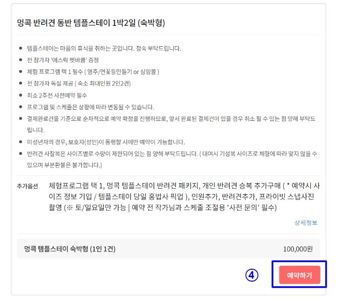 **멍콕 펫템플스테이의 기본 프로그램의 가격이 1인 1견당 100,000원입니다! 필요없는 추가 선택사항을 하지는 않았는지, 또는 추가해야 할 부분을 하지 못했는지 결제 전 미리 확인 하세요!
