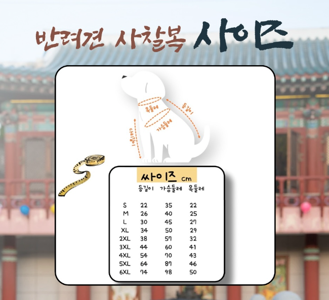 반려견 사찰복 사이즈를 미리 참고하시라 이렇게 친절하게 사이즈 표를 미리 알려주는 세심함은 솔직히 조금 감동인 것 같습니다. ^^ 귀염귀염하겠네요~