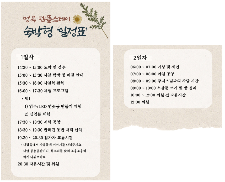 멍콕 펫템플스테이는 1박 2일 일정으로 첫째 날 오후 2시 30분부터 둘째 날 정오까지 입니다. 첫째 날은 30분 단위, 둘째 날은 보다 여유롭게 한 시간 단위로 프로그램이 예정되어 있습니다.
