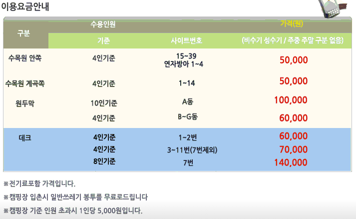 아래 내용은 캠핑을 하며 머무를 경우 기준 요금표 입니다. 성수기/ 비성수기와 주중/ 주말의 구분이 없어서 가성비 좋은 곳이기도 하니 참고하시면 좋을 것 같습니다.