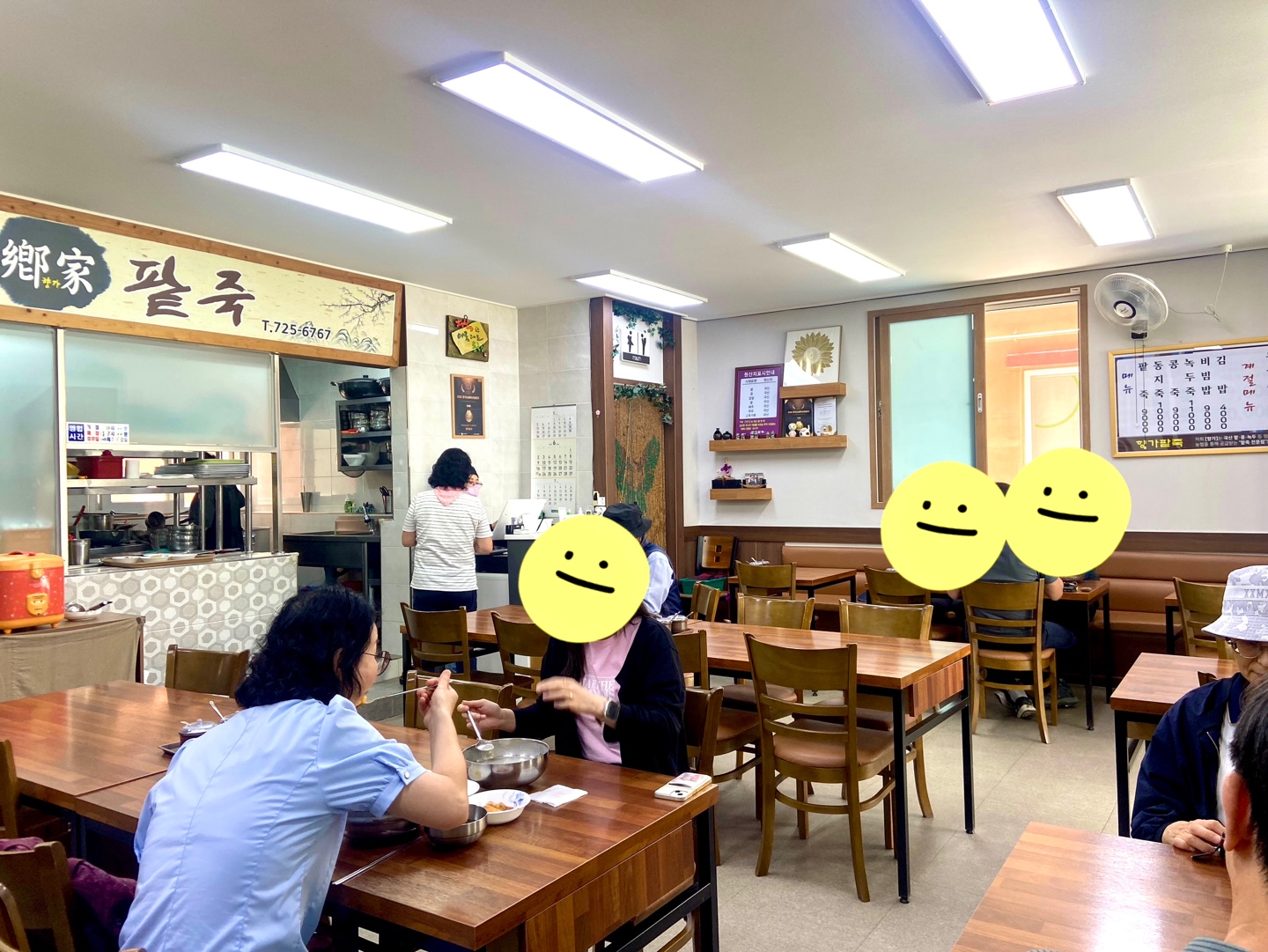 기다리는 동안 매장 내부를 탐색. 죽집 오른쪽으로는 업사이클 센터가, 정면에는 풍덕초등학교가, 그리고 주변에는 주택단지이지만 식당 및 카페 그리고 다른 업종의 가게들도 있어서 손님이 계속 들어왔다. 4인용 테이블이 족히 12개는 되어 보이고, 식당 내부는 쾌적하고 깨끗해서 기분이 좋아졌다.