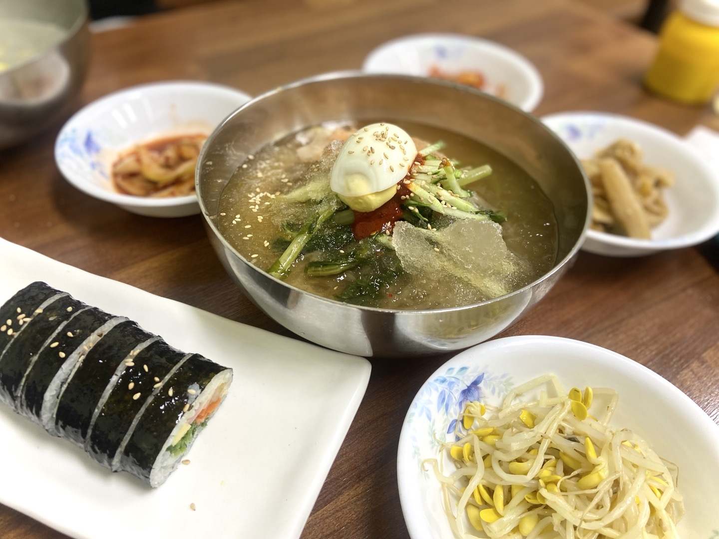 드디어 나왔다 우리의 주문 메뉴. 이게 웬걸 양이 왜케 많아. 셋이서 두 메뉴 나눠먹어도 충분한 양이지만 그래도 엄마 메뉴도 따로 시켜드리고 싶어서 평소 좋아하는 음식인 열무 냉면을 주문해드린다고 하니 엄마왈 "이 집 김밥이 또 별미다." ㅋㅋㅋ 추가 메뉴 기다리는 동안 먼저 나온 메뉴들을 먼저 맛보기로 했다.