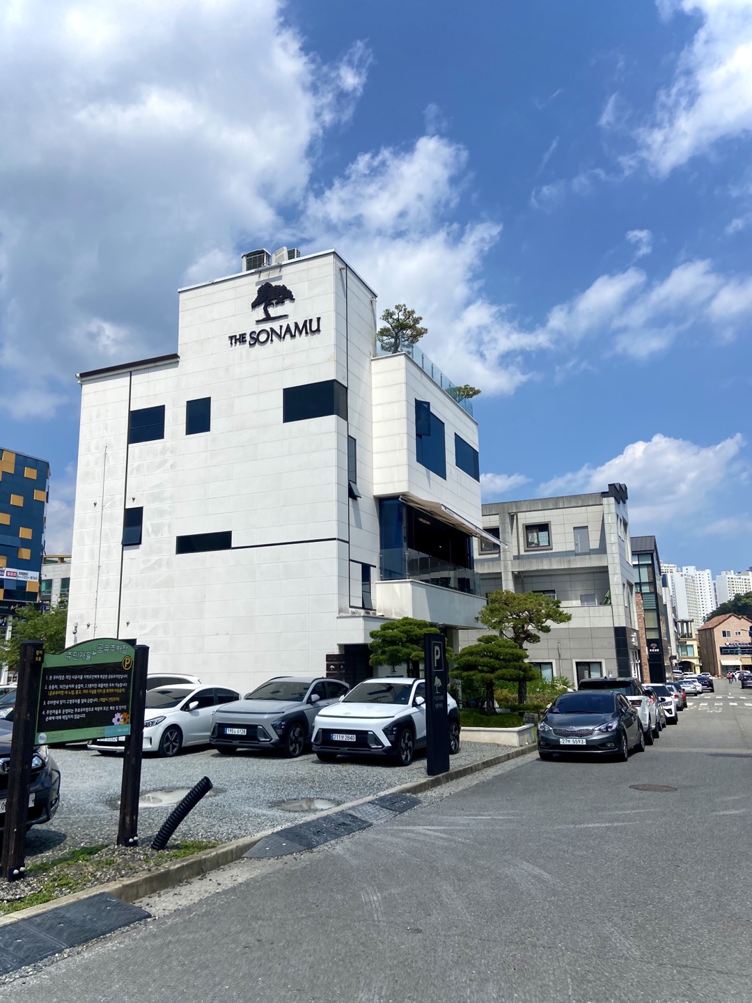 파란 하늘과 잘 어울리는 화이트 톤의 외관에 상호가 암시하는 것 처럼 외관에 멋진 수형의 소나무가 서 있습니다. 카페 건물 1층과 2층을 모두 카페로 운영중이고 주차는 카페 옆 공용 주차장이나 앞 쪽으로 해도 무관해요~