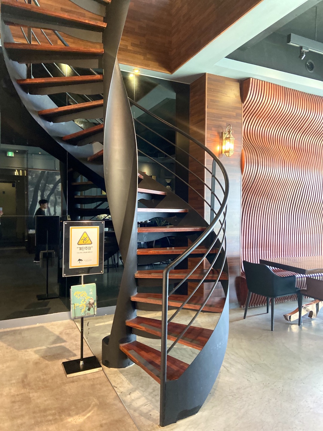 1층에서 2층으로 올라가는 계단이 두 군데가 있는데, 사진에 보이는 나선형 계단으로도 재미나게 오르내릴 수 있습니다.