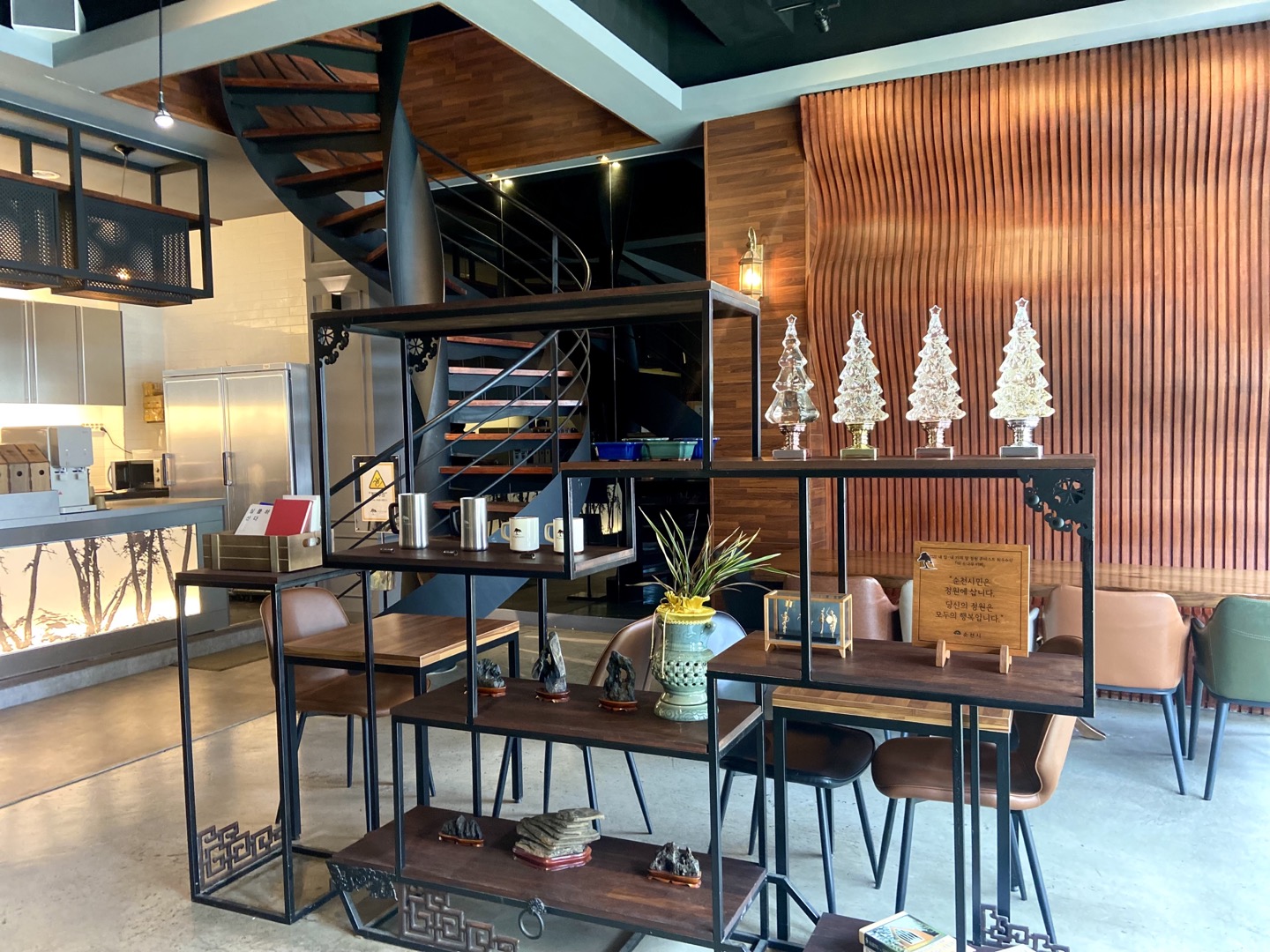 1층 메인 홀 중앙이 허전해보이지 않게 선반에 잘 정리된 더소나무 카페의 굿즈도 진열이 되어 있었고요. 조명에 반짝이는 크리스탈 소나무 장식품이 카페 매장을 한 결 화사하게 빛내주는 것도 포인트였어요.