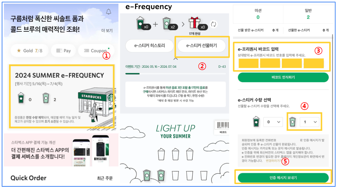④ 선물 할 e-프리퀀시(이프리퀀시)의 수량 선택(미션 음료, 일반 음료를 선택적으로 보낼 수 있습니다.)