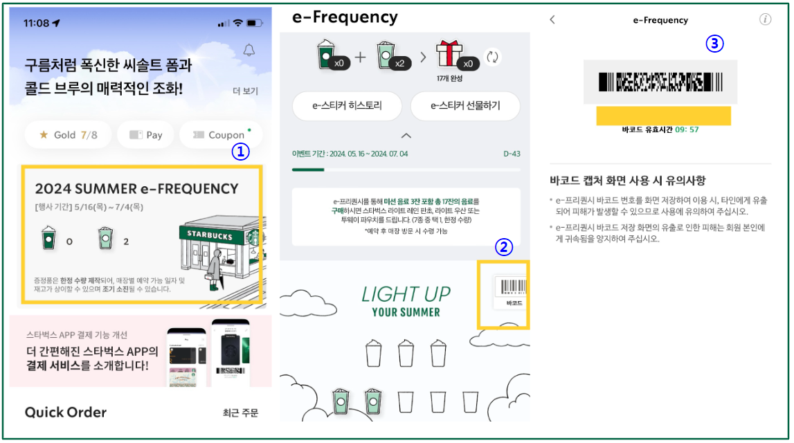 그런데 이 시기가 되면 한정 판매라는 분위기에 희소성을 느끼고자 마시지도 않는 커피를 사서 버리고 e-프리퀀시(이프리퀀시) 적립만 하기도 해서 뉴스에도 여러 번 보도가 났었습니다. 또한 당근마켓에서는 음료를 마시지 않고 음료보다 저렴한 금액으로 프리퀀시를 구매하여 이벤트 상품을 수령하기도 하더라구요.