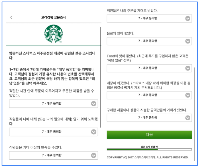 개인적으로 스타벅스 '파주 운정점'을 방문하며 불편했거나, 불쾌했거나, 음료에 문제가 있거나 한 점이 전혀 없었기 때문에 모든 항목에 7점(매우 동의함)을 선택했어요. (파주 운정점 이용하며 좋았던 점은 아래 더 적어보겠습니다.)