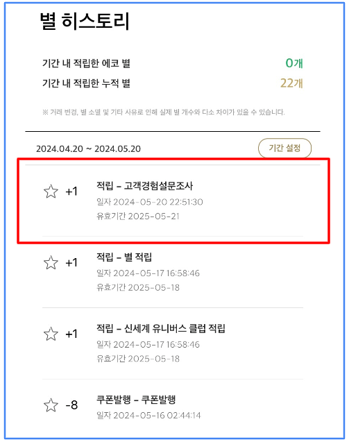 설문조사 완료 보너스 별⭐1개는 24시간 내에 적립해준다고 했는데~ 스피드 장난 아니었습니다. 저는 바로 딱! 적립 되었더라구요~