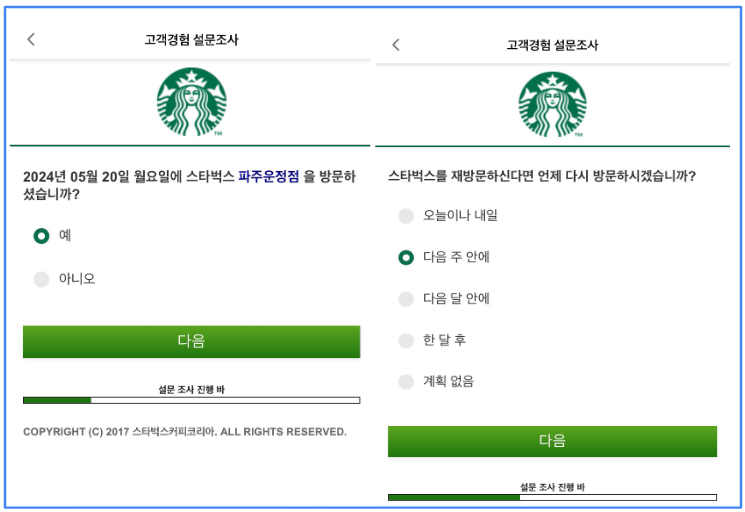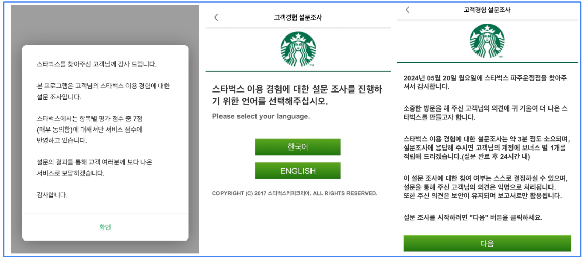 ① 설문조사 한국어로 진행 선택-> 어제 방문한 스타벅스 '파주운정점'에 대한 서비스 평가 설문 조사 시작 선택