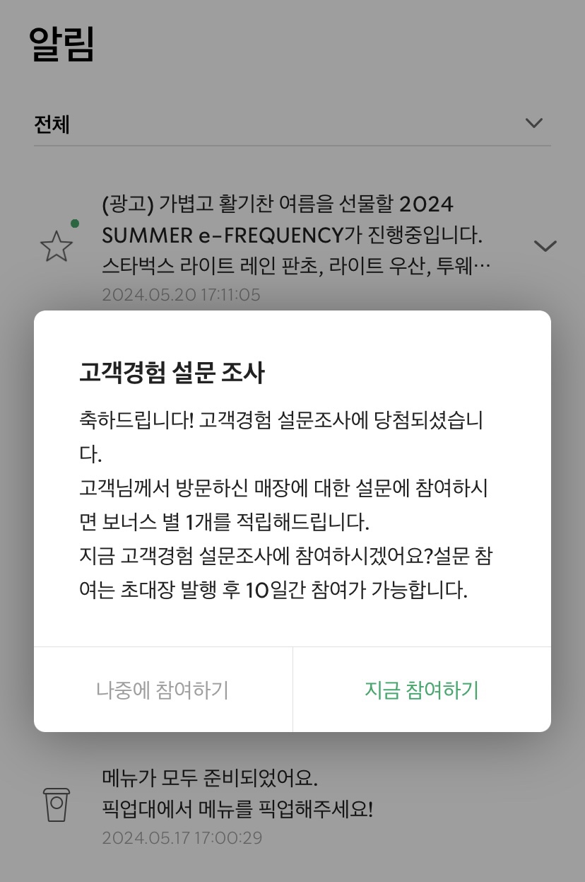한 밤에 스벅 알람이 딱! 새로운 뭔가가 저의 호기심을 자극했습니다. 그것은 스타벅스 '고객경험 설문 조사'!