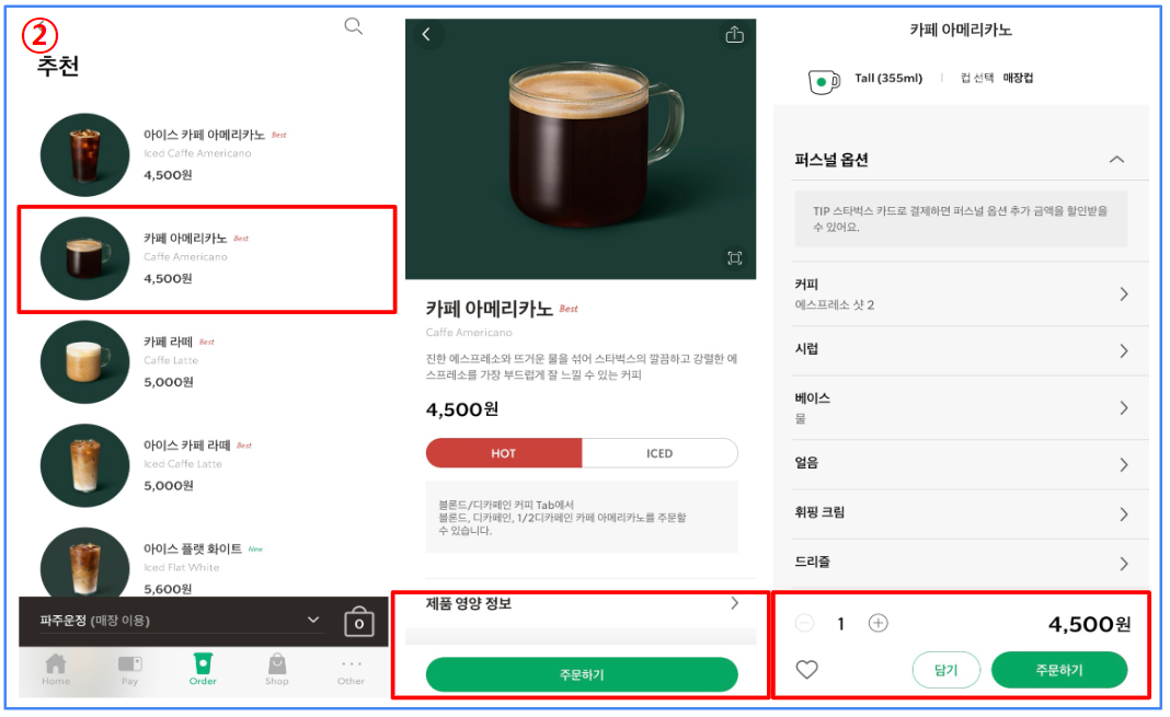 ② 카페 아메리카노(메뉴 변경 불가) 선택->> Hot 또는 Iced로 할 것인지 선택 후 주문하기 클릭->> 옵션(시럽 등) 추가 여부 확인 후 주문하기