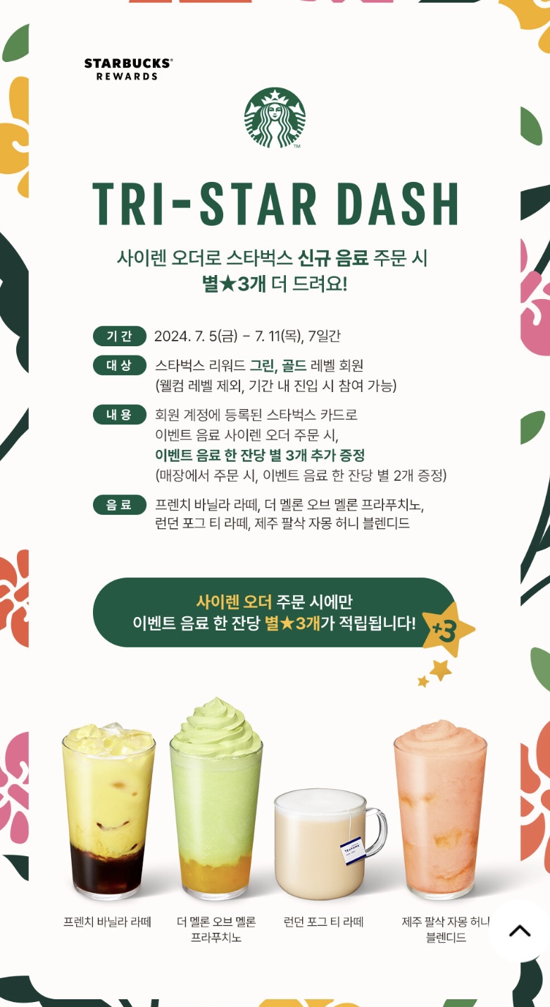 TRI-STAR DASH(트리스타대쉬)이벤트는 스타벅스 어플인 '사이렌오더'로 주문 시 ⭐별 3개 적립 받을 수 있는 이벤트 입니다. 아래 카드에 적혀져 있기는 하지만, 어플 사용이 어려운 분들은 매장에서도 주문 및 별 적립 혜택이 가능하지만 이 음료 한 잔 당 별 2개를 적립받을 수 있어요!