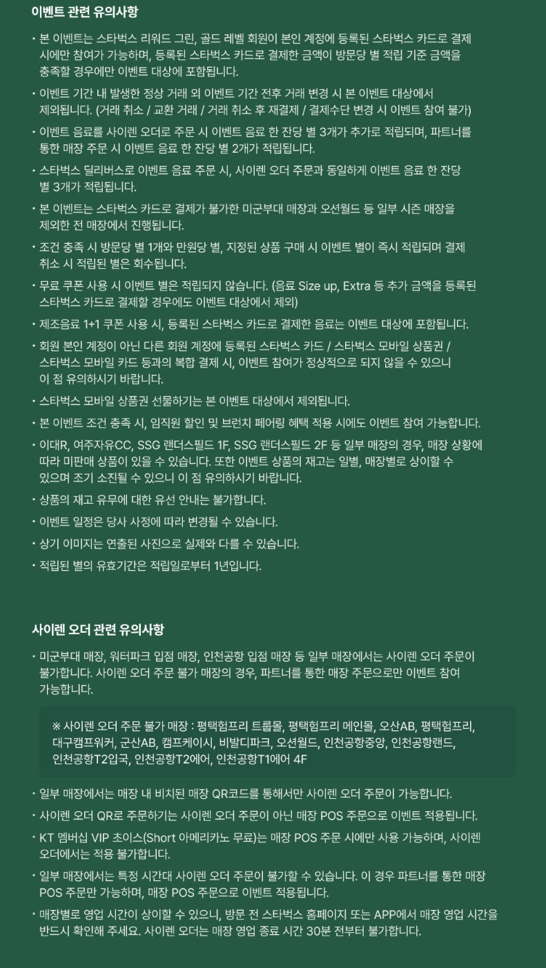 - 제조 음료 1+1 쿠폰 사용 및 스타벅스 카드로 결제한 음료는 이벤트 대상에 포함