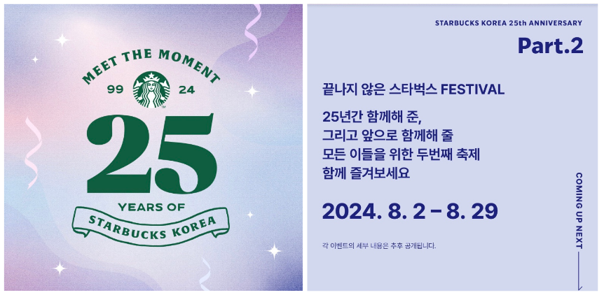 올해로 한국에 정착한 지 25주년을 맞이한 스타벅스가 7월부터 기념 새 음료 출시 및 베스트 커피 3종 최초 가격으로 제공 등 다양한 이벤트를 선보였는데요, 그 첫 번째 Part.1 이벤트가 8/1(목) 종료되고 8/2(금)부터는 Part.2라는 부재로 두 번째 이벤트를 선보이게 되었습니다.