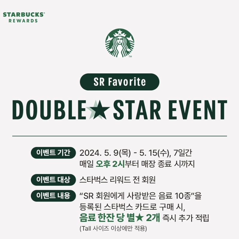 - 내용: 사랑받는 인기음료 10종을 등록된 스타벅스 카드로 구매시, 음료 한 잔당 별⭐️ 2개 즉시!! 추가 적립(tall사이즈 이상만 가능)