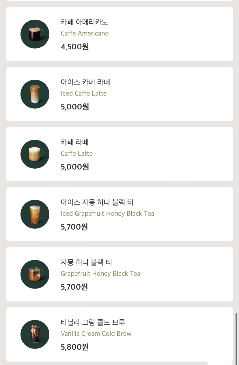 안내드리는 금액은 tall 사이즈 기준입니다!! 보통 같은 음료 ICED/ HOT 가격은 동일하니 참고하세요!