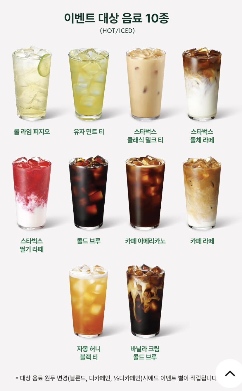 - 내용: 사랑받는 인기음료 10종을 등록된 스타벅스 카드로 구매시, 음료 한 잔당 별⭐️ 2개 즉시!! 추가 적립(tall사이즈 이상만 가능)