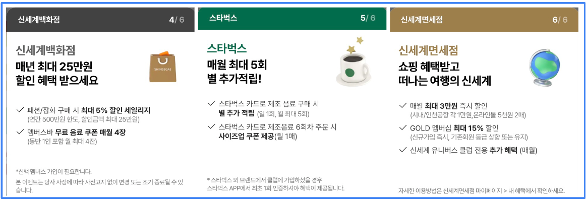 기존 회원과 동일하게 신세계 유니버스 클럽의 SSG닷컴, 이마트, G마켓, 옥션, 신세계 백화점, 스타벅스, 신세계 면세점 6개 제휴사 이외에도 이마트 24 편의점, 신세계 푸드, 스타필드 등도 혜택처가 추가 확대 예정이라고 하니(아직은 추가되지 않음) 각자의 생활이나 쇼핑 패턴에 맞는지 확인 후 가입을 결정하셔도 좋을 것 같습니다.