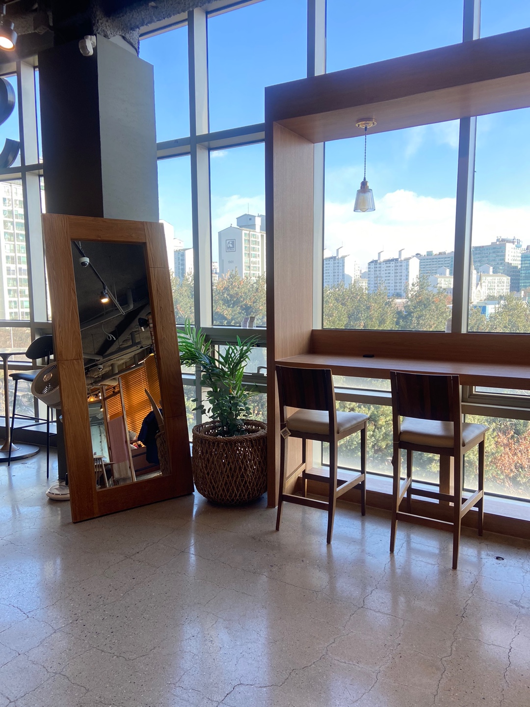 좌식 테이블 이외 이렇게 통창너머의 공간도 바 테이블로 구성해서 방문하시는 여러 사람의 취향에 맞게 착석하고 즐길 수 있도록 되어있습니다.