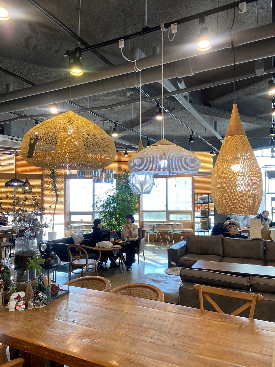 일산 인테리어 쇼룸 카페 카페뷰는 다양한 리빙 가구와 소품들로 공간이 채워진 곳으로 3층 대부분의 공간을 사용하고 있어서 내부 공간이 꽤 넓은 곳입니다.일산 호수공원을 정면으로 바라보고 있어서 채광이 좋은데, 라탄 조명의 따뜻한 빛과도 잘 어우러져 분위기가 정말 좋았어요.