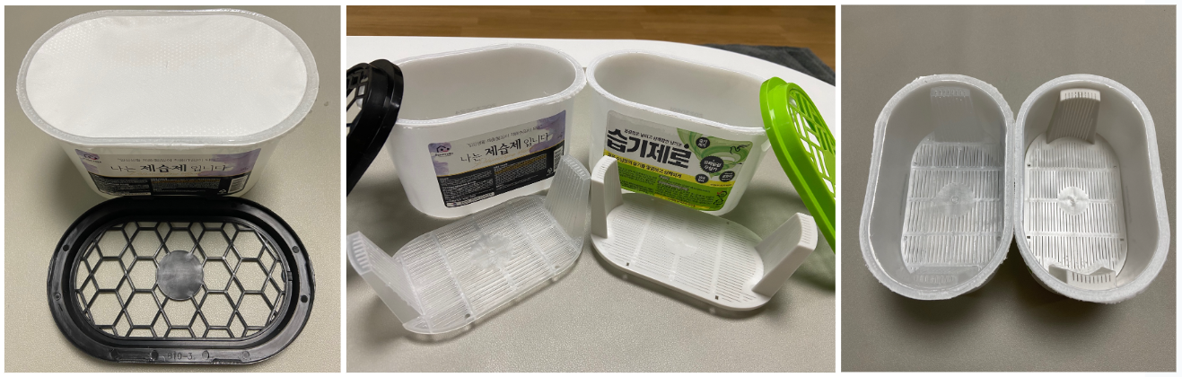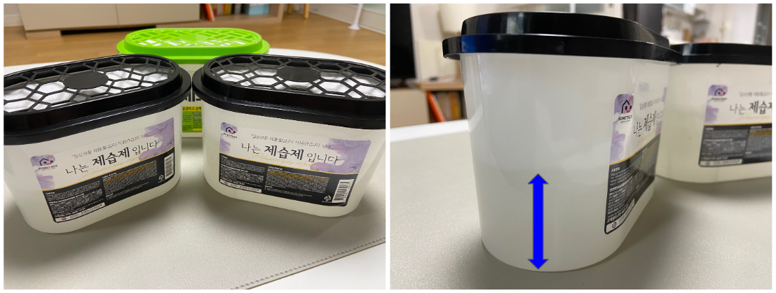 - 사용이 완료된 기존 제습제 용기: 저는 옷장에서 사용하던 두 종류의 다른 제습제를 수거했습니다. 브랜드와 판매처는 다르지만 기본적으로 염화칼슘을 넣는 본체, 염화칼슘 거치대, 부직포, 뚜껑으로 구성되어 있습니다. 흡수된 물이 다 찼어요.