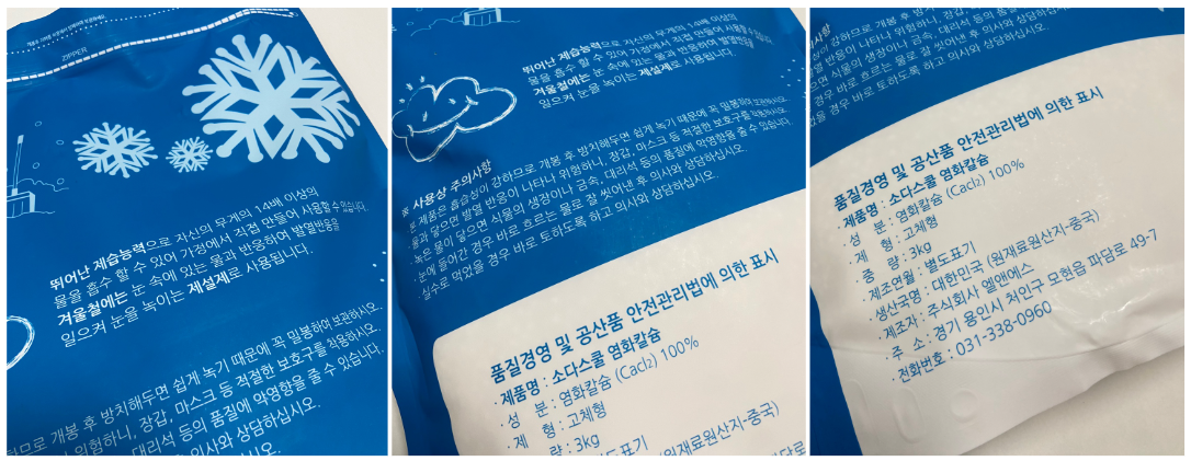 제품 뒷면에는 여름에는 제습용으로, 겨울에는 제설제로도 사용할 수 있다는 용도와, 습도에 취약하니 보관시 밀폐될 수 있도록 하는 것과 사람의 피부나 동식물의 피부에 직접 닿지 않도록 해달라는 주의사항, 그리고 제조연월과 제조자 등 상세 정보가 기재되어 있습니다.