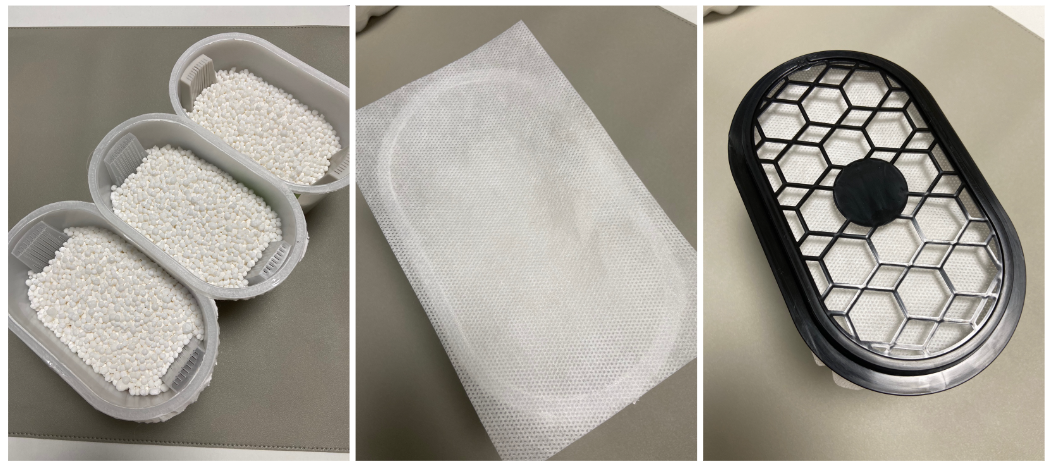 모양은 스티로폼 작은 알갱이들이 모여있는 모습, 그리고 외형은 가루세제를 뭉쳐놓은 듯한 느낌으로 맨들맨들하지는 않아요. 동그랗게 굳힌 마쉬멜로우 같기도 하구요. ^^ 마지막으로 필요한 부직포는 본체 사이즈보다 약간 크게 나와 뚜껑을 닫았을 때 본체가 잘 커버되도록 되어 있으며 작은 육각형모양으로 되어 있어요.