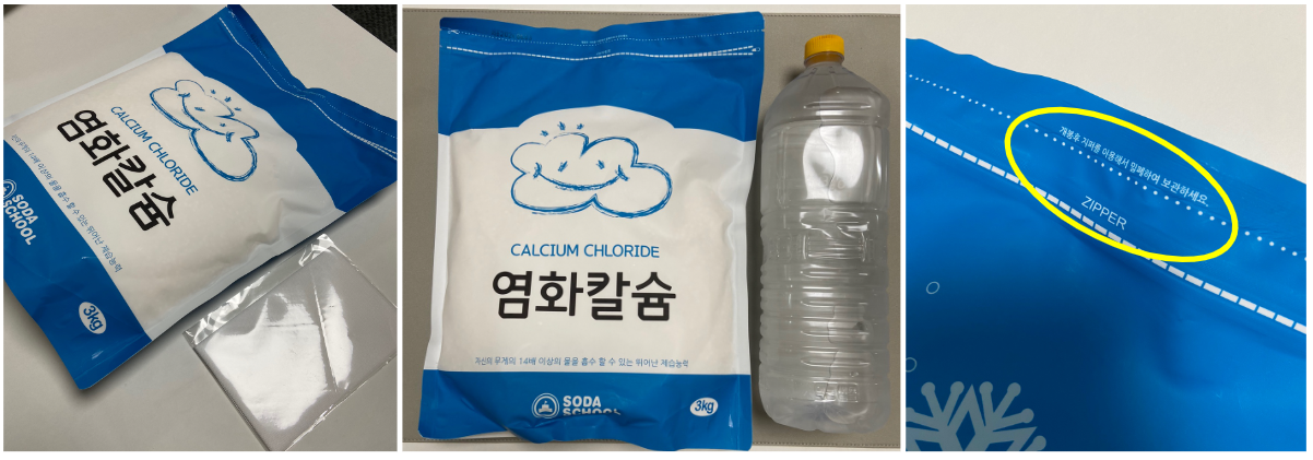 ✔ 염화칼슘은 실온에 노출된 순간 습도와 반응해서 물이 생기게 됩니다. 사용할 만큼만 덜어서 사용하고 남은 것들은 지퍼백에 잘 밀폐해서 보관하면 좋아요. (저도 실제로 물 흡수 속도 보고 깜짝 놀랐답니다!)각
