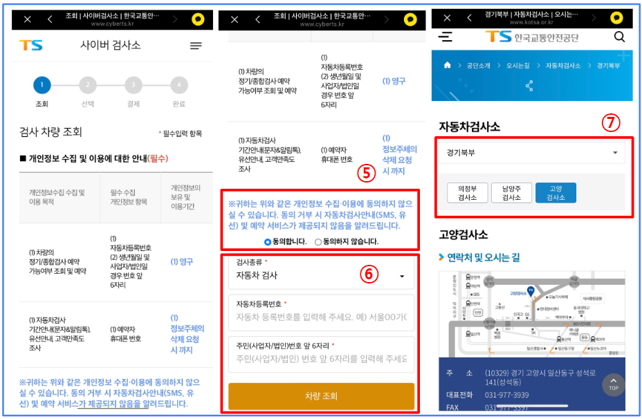 ⑥ 검사종류/ 자동차 등록번호/ 개인확인번호(주민, 사업자,법인번호) 입력