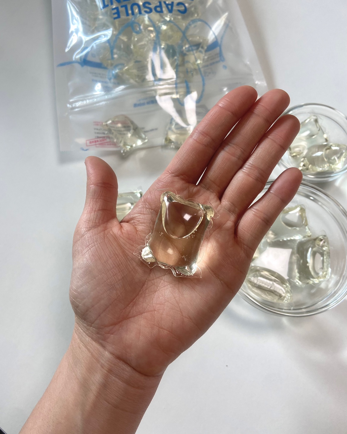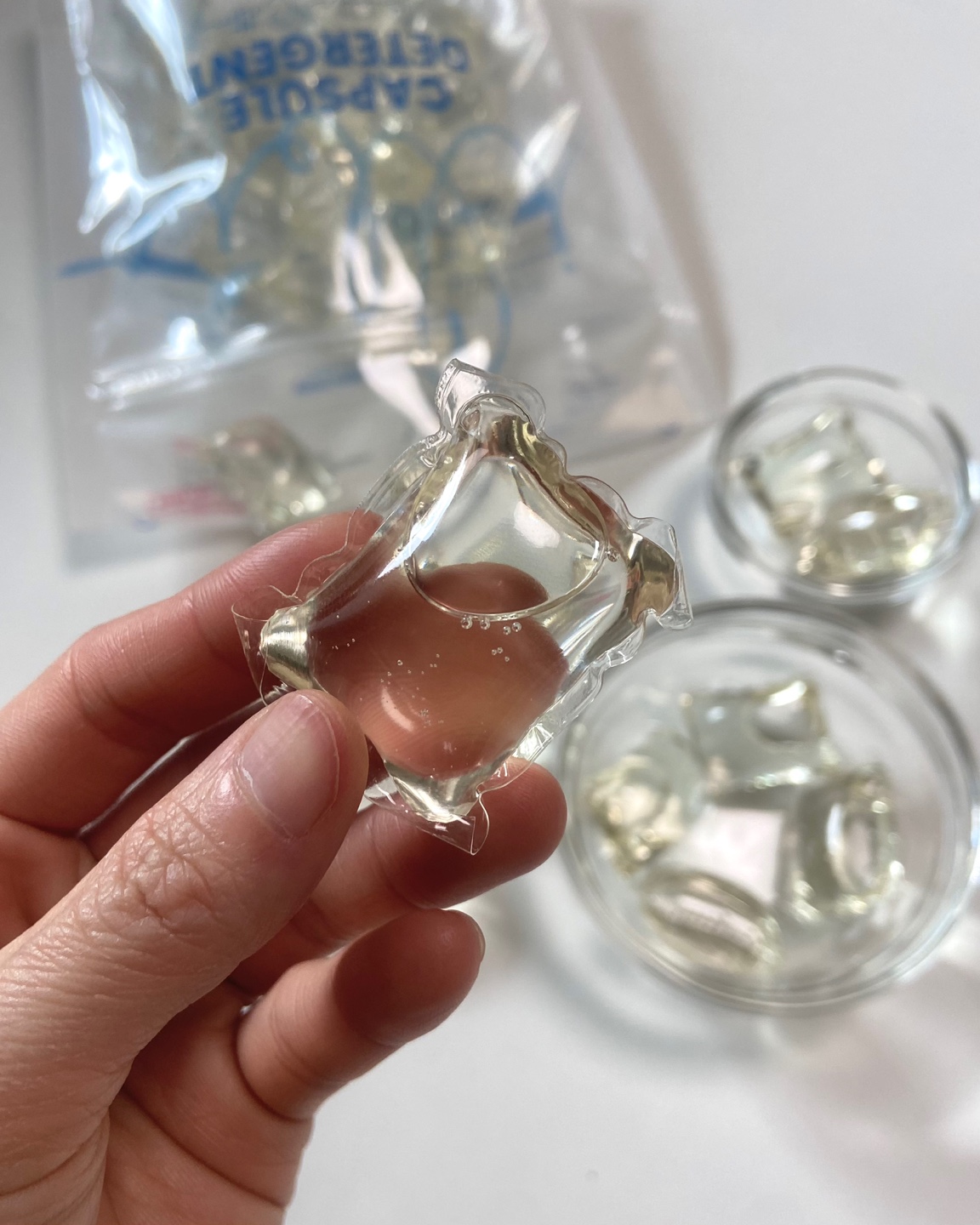 그 중 제가 가장 염려가 되었던 부분은 세탁물에 남을 잔류 세제였는데요, 그만큼 캡슐이 물에 잘 녹는 것이 관건이라고 생각했어요. 궁금한 것은 못 참는 저는 바로 실험에 돌입했는데 찬물에서도 약 4분 15초 만에 캡슐이 터지고, 이후 약 15분 내에 완전히 용해된 모습을 확인하게 되었습니다. 이때의 쾌감이란~ ^^ 뛰어난 용해력을 보니 세탁 세제로서의 기본기가 탄탄하다는 것을 한 눈에 알 수 있었네요~~
