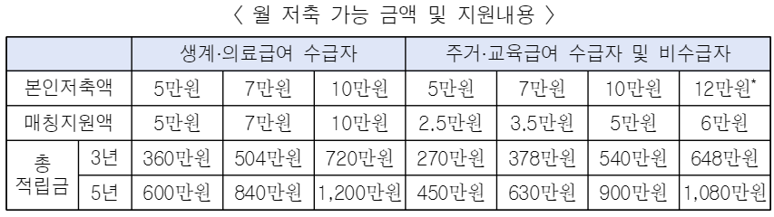 - 생계•의료급여 수급자는 본인 저축액의 100%를, 주거•교육급여 수급자와 비수급자는 저축액의 50% 적립