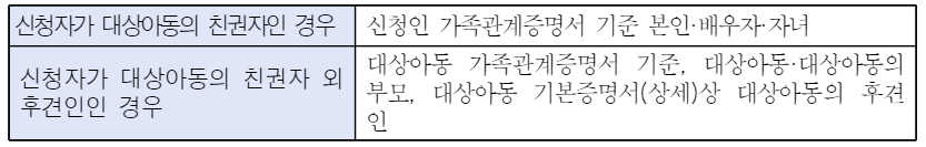 (자녀가 여러 명이어도 1명 앞으로만 신청 가능 하며, 세대 분리와 관계 없이 가족 증명서 및 기본증명서 기준 한정)
