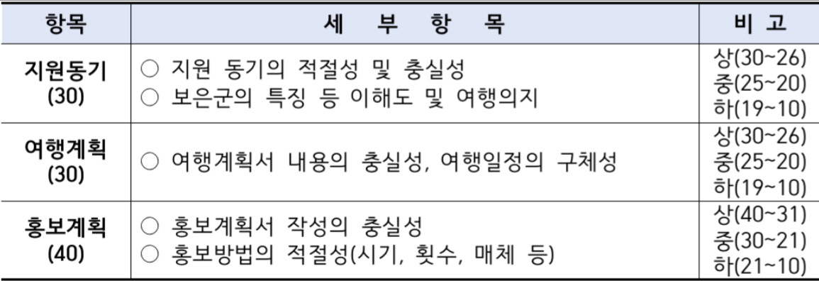 요즘 각 지자체의 홍보를 위해 모집대상 및 선정 방법에서 팔로워 등을 제한을 두고 모집하는 경우가 많이 있어서 좀 씁쓸했는데 보은은 다행히 지원동기, 여행계획, 홍보계획등의 선정기준에 충실할 것을 보고, 이후 인플루언서 우대가 적용되는 것 같아보입니다.