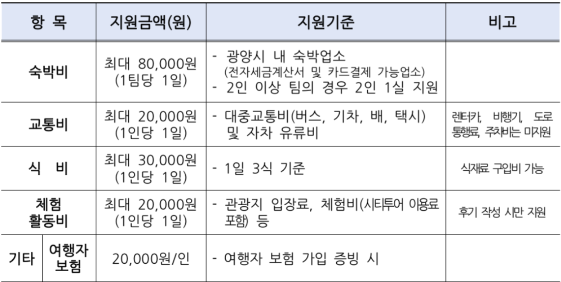 | 지원금 신청 | 여행 종료 15일 이내 여행 및 홍보 결과보고서 및 과제 수행자료, 지원금 신청서 등을 제출 (붙임 서식 참조) |