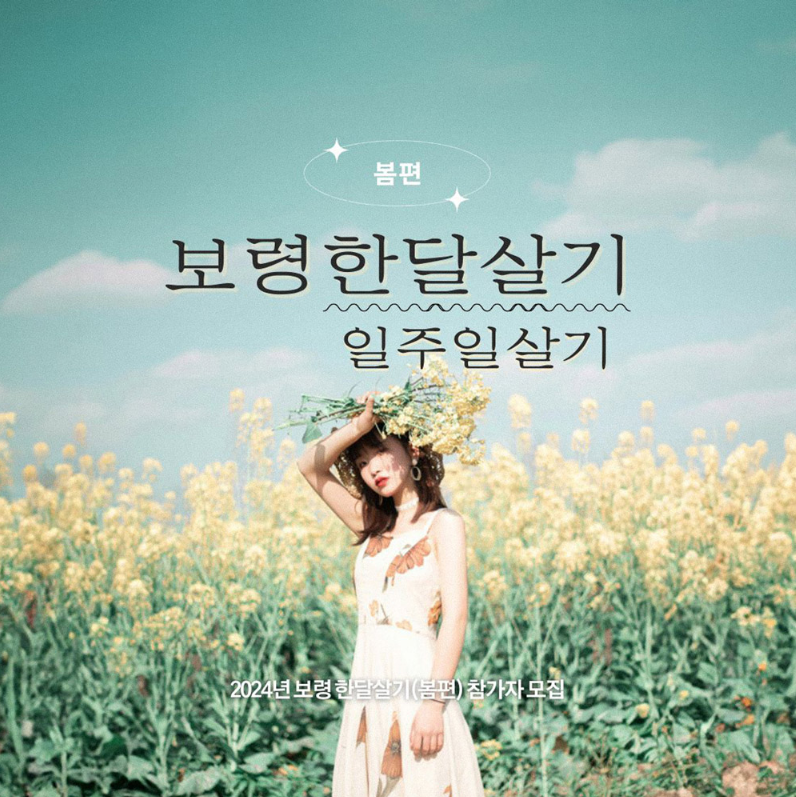 아름다운 무창포, 대천 해수욕장 그리고 다양한 축제와 역사적인 장소까지 다양한 명소와 경험을 할 수 있는 보령에서 드디어 한 달 살기 프로그램을 오픈했습니다. 보령에서 머물며 개별 자유 여행을 진행하여 관광자원, 지역문화예술, 역사자원, 지역축제 등을 체험하고 SNS 등에 홍보하는 프로그램으로 보령시에서 체류형 여행 분의기를 확산하고자 한 달살기(봄편)을 추진한다고 합니다.