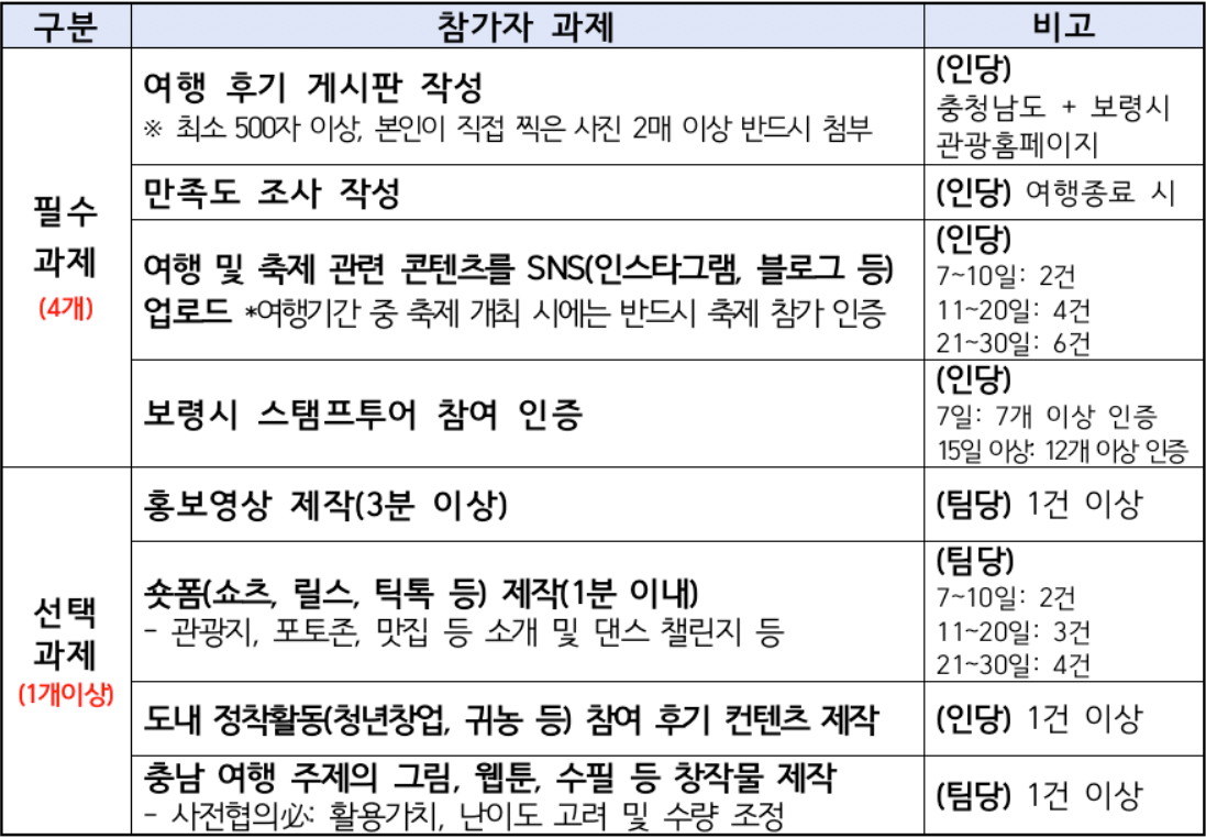 이 프로젝트에 선정이 되면 참가자는 보령시에서 요청하는 과제를 이행해야 여행 지원금을 원활하게 지원 받을 수 있습니다.