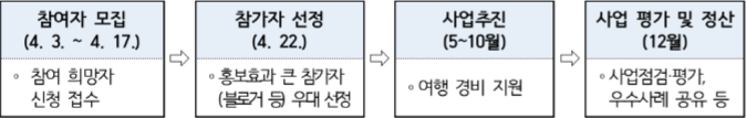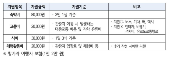 - 제출서류: 홍보 결과 보고(서식5), 숙박비용 지원 신청서(서식6), 여행비용지원 신청서(서식7), 증빙사진(서식8. 서식9), 만족도 조사(서식10)