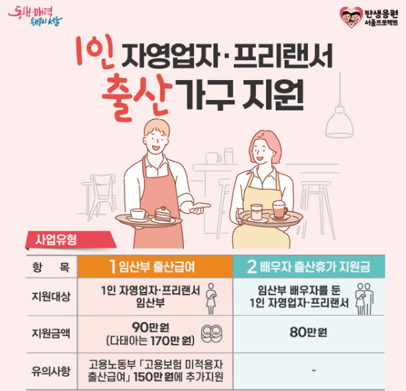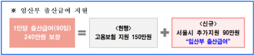 출산한 여성 자영업자•프리랜서는 기존 고용보험 지원금 150만 원에서 서울시가 추가로 90만 원을 지원해 총 240만 원을 90일동안 보장 받을 수 있습니다.