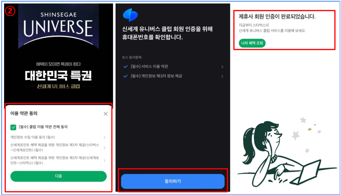 ② 유니버스 클럽 이용약관 동의 ->> 토스 및 인증 기관 동의->> 제휴사를 통한 회원 인증 완료!!!