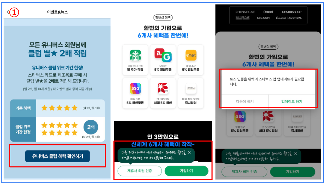 ① 스타벅스 사이렌 오더 앱 '이벤트 & 뉴스- 유니버스 클럽 위크' 선택->> 유니버스 클럽 혜택 확인하기 클릭->>