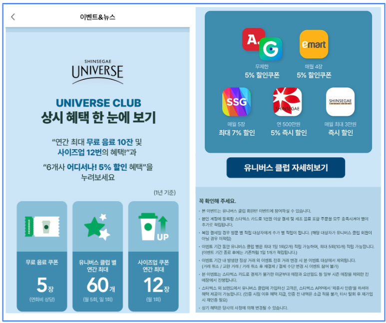 스타벅스를 적지 않게 이용하시는 분, SSG 계열의 제휴사를 자주 이용하시는 분들은 유니버셜 클럽에 이미 가입하셨을 것 같습니다. 지금 안내드리는 부분은 '유니버스 클럽' 회원분들을 위한 소개이며, '유니버셜 클럽' 회원가입을 하지 않으신 분들은 본인의 쇼핑이나 여가 등을 고려하여 전체적인 혜택을 둘러보신 후 회원 가입 하고 이용하시면 됩니다.