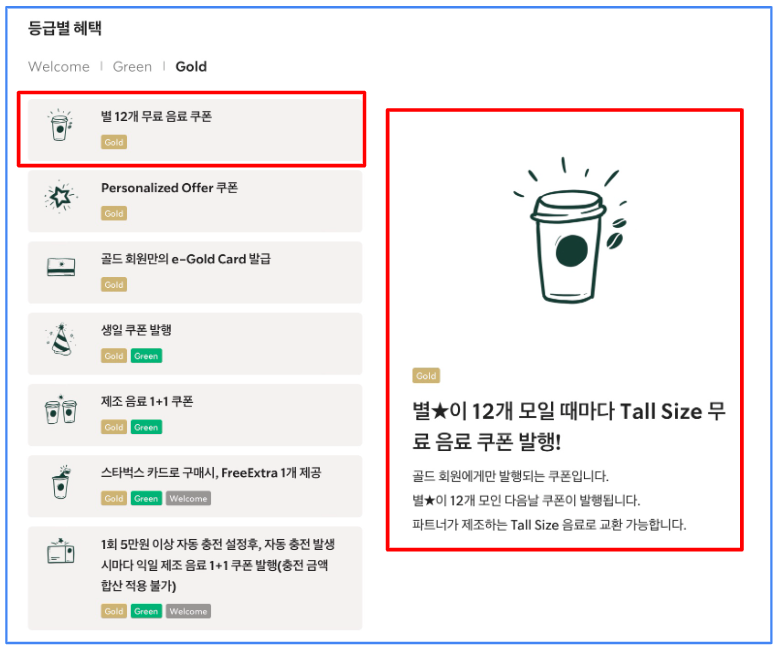 이 이벤트가 나름 의미 있는 이유는 스타벅스 골드 회원 이상인 분들은 별 ⭐ 리워드가 12개씩 모일 때 마다 무료 음료 쿠폰이 제공되기 때문입니다.